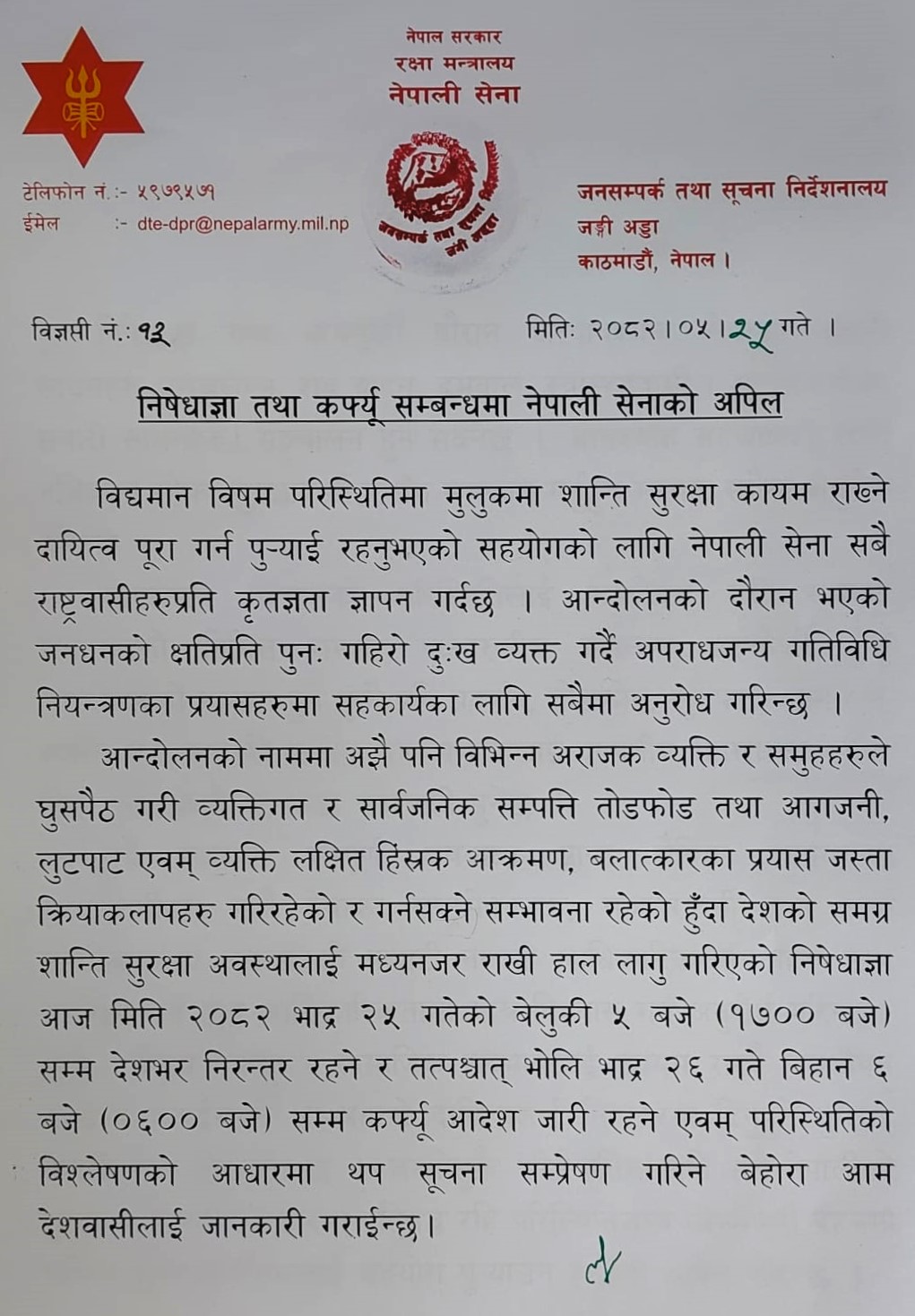 सेनाले विद्यमान परिस्थितिलाई ध्यानमा राख्दै मुलुकभर आज बेलुकी ५ बजे (१७ः०० बजे) सम्म निषेधाज्ञा निरन्तर रहने जनाएको छ । अत्यावश्यक सेवा कर्मचारीलाई कार्यालयमा काम गरेर फर्कन सजिलो हुने छ । त्यसैगरी, भदौ २६ गते बिहान ६ बजेसम्म कफ्र्यू आदेश जारी हुने जनाएको छ । रक्षा मन्त्रालय मातहतको नेपाली सेनाको जनसम्पर्क तथा सूचना निर्देशनालयले मंगलबार जारी गरेको अपिलमा आन्दोलनका क्रममा सार्वजनिक तथा व्यक्तिगत सम्पत्ति तोडफोड, आगजनी, लुटपाट, हिंस्रक आक्रमण तथा यौनजन्य हिंस्रक प्रयाससमेत भइरहेका घटनाप्रति गम्भीर चिन्ता व्यक्त गरिएको छ । यस्ता अपराधजन्य गतिविधि नियन्त्रणका लागि सम्पूर्ण नागरिकसँग सहकार्यका लागि आग्रह गरिएको छ । सेनाले आन्दोलनको क्रममा जनधनको क्षतिप्रति पुनः गहिरो दुःख प्रकट गर्दै यस्तो संवेदनशील परिस्थितिमा सुरक्षाकर्मीको प्रयासलाई साथ दिन सबैलाई अनुरोध गरेको छ । निषेधाज्ञा तथा कफ्र्यूको समयमा अत्यावश्यक सेवासम्बन्धी सवारी साधन (एम्बुलेन्स, शववाहन, दमकल, स्वास्थ्यकर्मी तथा सुरक्षाकर्मीका सवारी साधन) भने सञ्चालन हुने जनाइएको छ ।