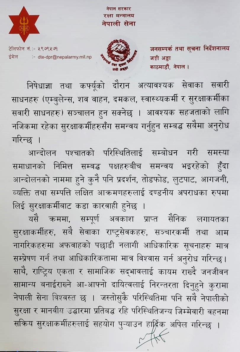 आन्दोलनका नाममा हुने कुनै पनि प्रदर्शन, तोडफोड, लुटपाट, आगजनी, व्यक्ति तथा सम्पत्ति लक्षित आक्रमणलाई दण्डनीय अपराधका रूपमा लिई कडा कारबाही गरिने चेतावनीसमेत नेपाली सेनाले दिएको छ । त्यसैगरी, सम्पूर्ण अवकाशप्राप्त सैनिक, राष्ट्रसेवक, सञ्चारकर्मी र आम नागरिकलाई अफवाह वा भ्रामक समाचारमा विश्वास नगरी आधिकारिक सूचनामा मात्र भरोसा गर्न आग्रह गरिएको छ । सेनाले राष्ट्रिय एकता, सामाजिक सद्भाव र जनजीवनलाई सामान्य राख्न सबैको सहयोग आवश्यक रहेको उल्लेख गर्दै जस्तोसुकै परिस्थितिमा पनि नेपाली जनताको सुरक्षा र मानवीय उद्धारमा आफ्नो दायित्व पूरा गर्ने प्रतिबद्धता व्यक्त गरेको छ ।