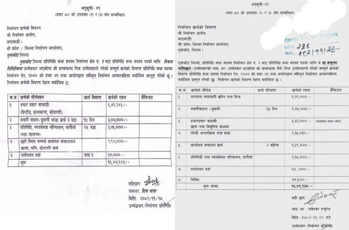 यसपटक निर्वाचनमा नुवाकोटका दुई क्षेत्रमा रास्वपाका उम्मेदवार पुराना काङ्ग्रेस र कम्युनिस्टका उम्मेदवारलाई रु.३२ लाख ५७ हजार एक सय ७५ खर्च गरेर पराजित गर्न सफल भएका छन् । विगतका निर्वाचनमा पैसाको खोलो बग्ने नुवाकोटमा यसपटक न्यूनतम पैसा खर्च गरेर रास्वपाका डा. विक्रम तिमिल्सिना र डा.अच्युत्तम लामिछानेले काङ्ग्रेसको गढ ध्वस्त बनाइदिए । नुवाकोट १ बाट उम्मेदवार बनेका डा.तिमिल्सिनाले दुई पूर्वमन्त्रीलाई हराउनुभएको छ । उहाँले रु. १६ लाख ४७ हजार दुई सय ४५ खर्च गरेर २२ हजार ६ सय नौ मत प्राप्त गरी विजय हुँदा उहाँका निकटतम प्रतिस्पर्धी काङ्ग्रेसका नेता तथा पूर्वमन्त्री डा. प्रकाशशरण महत चार हजार १२ मतकोे मतान्तरबाट पराजित हुन पुग्नुभयो । डा. महतले १८ हजार पाँच सय ९७ मत पाउनुभएको थियो । त्यसैगरी सोही क्षेत्रबाट प्रतिस्पर्धामा रहनुभएका नेकपाका नेता तथा पूर्वमन्त्री हितबहादुर तामाङ १३ हजार तीन सय ७७ मत प्राप्त गर्दै तेस्रो हुनुभयो । सो क्षेत्रका उम्मेदवार काङ्ग्रेसका डा. महतले रु.२५ लाख ३५ हजार खर्च गर्नुभयो भने नेकपाका तामाङले रु. २६ लाख २३ हजार नौ सय ७२ खर्च गरेको विवरण निर्वाचन कार्यालयमा पेस गर्नुभएको छ । विगतका चुनावमा सबैभन्दा बढी खर्च हुने नुवाकोट २ मा यसपटक रास्वपाका डा. लामिछानेले रु. १६ लाख नौ हजार नौ सय ३० खर्च गरेर १६ हजार पाँच सय ५१ को मतान्तरमा निर्वाचन जित्नुभयो । उहाँले काङ्ग्रेसका जगदीश्वरनरसिंह केसीलाई पराजित गर्दै ३२ हजार ५४ मत प्राप्त गर्नुभयो । सो क्षेत्रबाट निकटतम प्रतिस्पर्धी केसीले १५ हजार पाँच सय तीन मत प्राप्त गर्नुभयो भने तेस्रो बन्नुभएका एमालेका केशवराज पाण्डेले आठ हजार दुई सय ८५ मत पाउनुभएको थियो । सो क्षेत्रमा यसपटक केसीले रु.२२ लाख ७५ हजार र पाण्डेले रु.२८ लाख ५० हजार खर्च गरिएको विवरण निर्वाचन कार्यालयमा बुझाउनुभएको छ । सो क्षेत्रबाट विजयी रास्वपाका डा.लामिछानेले मतदाता नामावली खरिद तथा छपाइमा रु. एक लाख २९ हजार, सवारीसाधन/ढुवानीमा रु. दुई लाख ४५ हजार, प्रचारप्रसार सामग्री, छाप तथा विद्युतीय माध्यममा रु.पाँच लाख ३२ हजार (सामाजिक सञ्जालसहित), गोष्ठी, अन्तरक्रिया तथा सभामा रु. दुई लाख ३५ हजार ३०, दुई महिना कार्यालय सञ्चालन खर्चमा रु.एक लाख ६९ हजार चार सय, प्रतिनिधि तथा स्वयंसेवक परिचालन र घरदैलामा रु.दुई लाख १५ हजार, मनोनयन दर्तामा रु.१० हजार र विविधमा रु.७४ हजार पाँच सय खर्च गरेको विवरण सार्वजनिक भएको छ ।