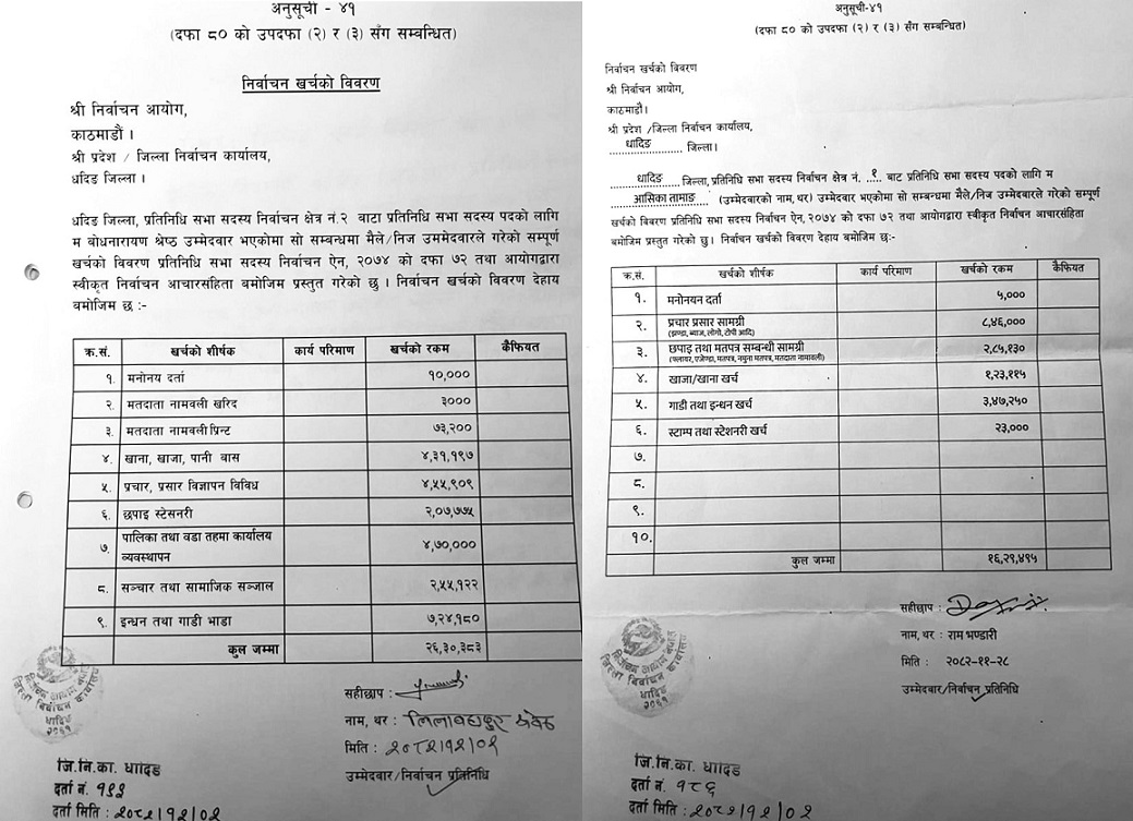 आयोगले दिएको सीमाभन्दा कम खर्च देखाएका उम्मेदवारले सरदर रु.२५ लाखवरिपरिको विवरण बुझाएका छन् । मुख्य चार दलका उम्मेदवारको मात्रै हिसाब गर्दा हरेक निर्वाचन क्षेत्रमा कम्तीमा रु.एक करोड खर्च गरेको देखिन्छ । यो हिसाबलाई मात्रै मान्ने हो भने पनि एक सय ६५ निर्वाचन क्षेत्रमा थोरैमा पनि रु. एक अर्ब ६५ करोड खर्च हुन आउँछ । अन्य सबै दल र स्वतन्त्र उम्मेदवारको खर्च जोड्दा कैयौँ गुणा बढी अनावश्यक खर्च भएको देखिन्छ । अझै वास्तविक खर्चको हिसाब कसैले बुझाएका छैनन् ।
